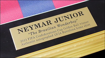 今回ご紹介する作品はバルセロナで活躍するネイマール選手のサインが書かれたユニフォームの額。ユニフォーム中央に大きなメッセージ入りのサインが執筆されています。メッセージはポルトガル語で「幸運を祈る」というニュアンスの言葉が書かれているそうです。ユニフォームに書かれたサインがシワで隠れることなく、きれいに表示させることができるため、当社にご依頼頂きました。